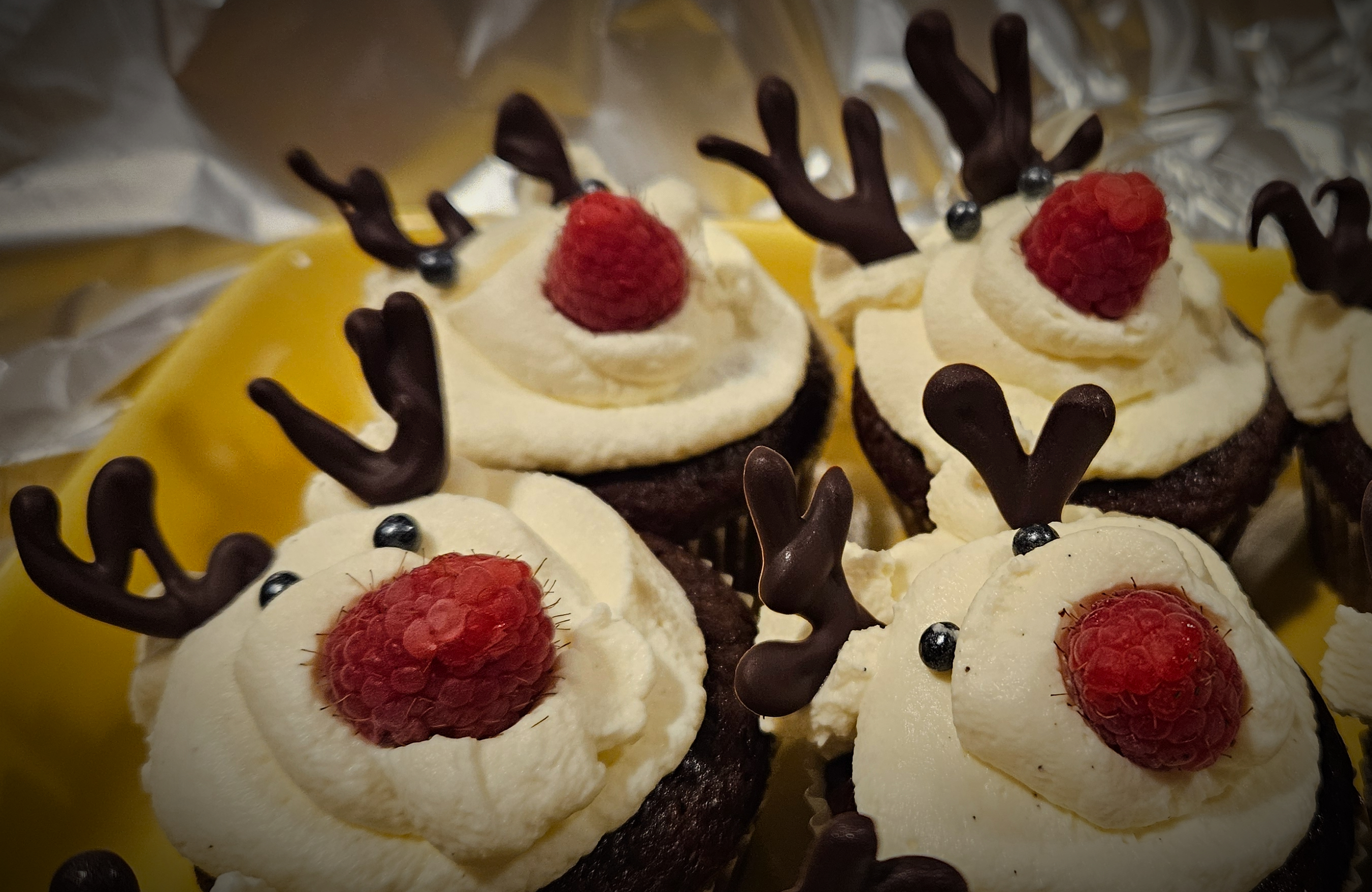 Sulata suklaa ja pursota leivinpaperille sarvia (sula suklaa Minigrip-pussiin ja pieni aukko kulmaan). Jäähdytä suklaasarvet jääkaapissa. Pursota kerma-tuorejuustoseos jäähtyneiden kuppikakkujen päälle. Koristele nenä vadelmista, silmät koristerakeista ja sarvet jähmettyneistä suklaapursotuksista.