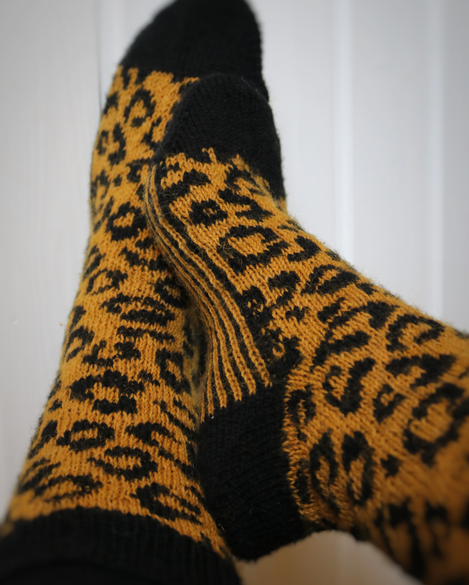 Loppukesästä sain päähäni, että tarvitsen syksyksi ehdottomasti leopardikuvioiset sukat. Ajatus lähti oikeastaan itse värjäämästäni okransävyisestä langasta. Väri on saatu lakastuneista omenapuun lehdistä. Ohjetta leopardisukkiin ei ollut, mutta Pinterest-seikkailuni antoi osumaksi Crafting for weeks -sivustolta ilmaisen leopardikaulurin kaavion. 72 silmukalla jaollinen kaulurikaavio oli fingering-vahvuiselle langalle varpaista varteen aloittaessa juuri passeli silmukkamäärä myös sukkiin. Varsiosuudella silmukoita voisi työn edetessä mutulla lisäillä sinne ja tänne, jotta varren leveys riittää pohkeeseen. Päätin soveltaa silmukoiden lisäyksen työn edetessä.